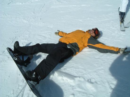さて天候も少し落ちついたようなので「今日こそはパウダー喰える。」と思ってゲレンデに出かけたが、相変わらずTバーのみの運行。幸い一番奥の長いTバーがオープンしたので、そこで滑ろうと思ったがみんなも同じ考えのようで大渋滞。ゲレンデは空いてるんだけどTバー待ちが30分ぐらいとかなりダルい。我慢して並んで、念願のパウダー頂く事ができました。斜度が足りないのと雪の量が思いのほか少なく浮くような感じは味わえなかったが、久しぶりのパウダーに満足。もうすぐレースだから遊んでばっかりもいられない。練習もしたさぁ〜。でも昼まで頑張っても5本ぐらいしか滑れなかった。もう待つのもツライのでランチして帰ろうと思ったら、クワッドリフトが開いていた。クワッドからはかなり多くのオフピステにアクセスできるのだ。行こうかと思ったけど疲労の事も考えて止めておきました。レースのため此処に来ているのだからね。う〜ん残念。