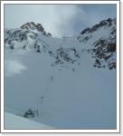 明け方すごい強風で目が覚めた。地鳴りのように建物に響いてる。三角形の建物が多いのは強風が吹き抜ける土地だからか? 今日は昨日行かなかった左の谷の奥に行ってみた。リフトを3本乗り継ぐとピーク辺りに出られる。その3本目のリフトは急勾配の岩場にかかっていて、リフト線下はパウダーだったらかなり楽しめそう。でもこれゲレンデ内なのかな? 強風で何回もリフトが止まってしまい、ピークに到着するのに40分もかかってしまった。すげぇ寒かった・・・。そしたらスタッフが「オフピステに行くか?」と聞いてきたので、「行きたい!」と答えると「書類に記入しろ」と言う。名前、国籍、宿泊先、パスポートナンバー、サインを記入したら、ナンバーを記入した紙帯を結びつけてくれた。そして「どこでも滑ってOK!」だって。リフト線下の岩場やシュートもOKってことか? う〜ん素晴らしい。「自己責任でどうぞ。」って事なんだな。早速リフト線下に突入。残念ながらパウダーは無く、吹き溜まりの柔らかい雪と締まった雪が混在する急斜面不整地だった。板は暴れまくってまともなターンを刻めないが、限界攻めてる感じで超楽しかった。とても一気には降りられず足はパンパンで辛かった。