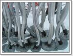 写真:Tバーリフト。このまるい部分を股に挟んで引っ張られます。ここのは曲げが入っているのでフリースタイルでも内股が痛くなりにくい親切設計。登っていく途中でコーナーがあったり、高速リフトみたいに搬器がワイヤーから離れる構造になっていて珍しい。こんなのオイラはじめて見た。