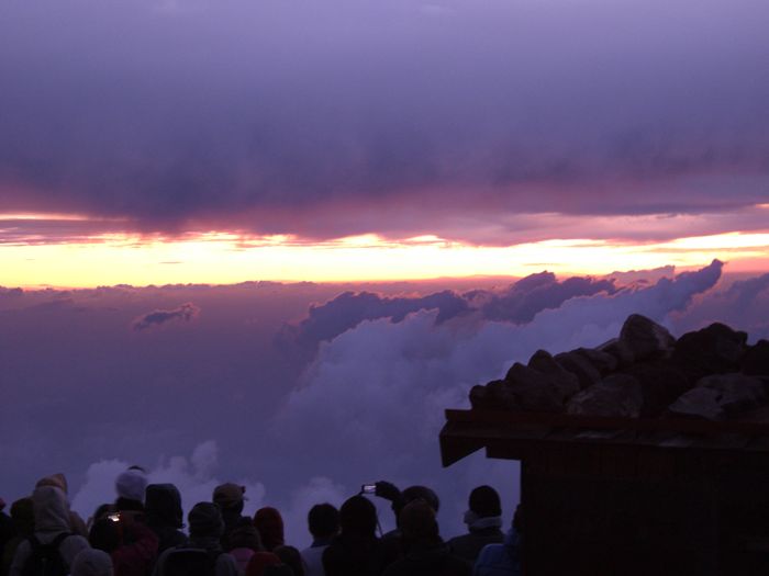 念願の山頂は大賑わいで雲にかかってハッキリしなかったけど御来光も拝み無事に下山道を帰ってきました