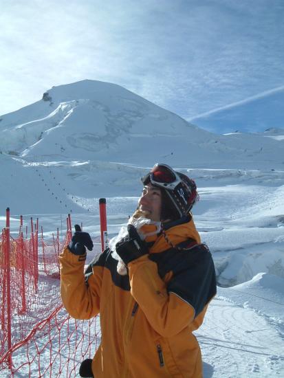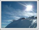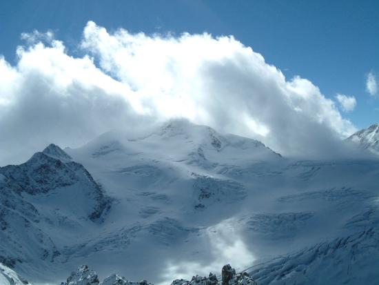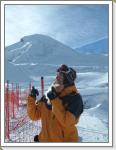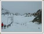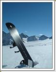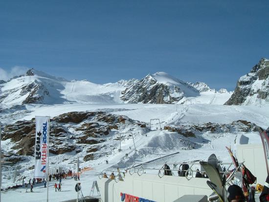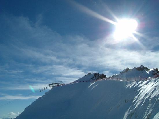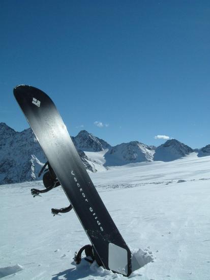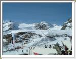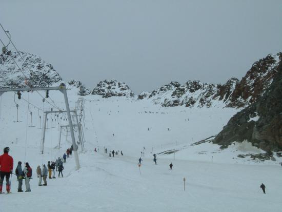 今朝は少し冷え込んでいてゲレンデに着いたときは小雪が舞い風も少し吹いていた。昨夜の積雪は3〜5cmぐらいかな。下部の石はだいぶ隠れてきた。昨日と同じバーンでバインのセッティング変えながらフリーラン。ゴンドラ乗ってトップ(3440m)にも行ってみた。岩山と氷河に囲まれた美しい景色にしばし滑るのを忘れる。トップからは急斜面で少々荒れていて、まだ足慣らしのオイラにゃチョイと手強かった。