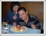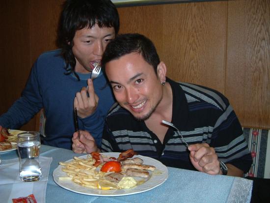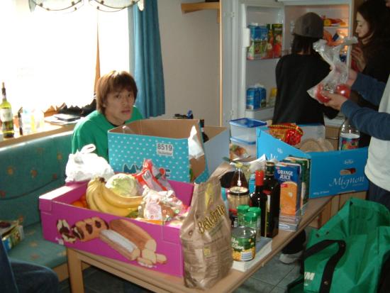 今日は皆さんOFFで達は小嶋アカデミーと一緒に山に上がる予定だったが、ピッツはかなりガスっていて雪も降り視界不良なのでOFFにしました(20cmほど積雪があったらしい!)。そこで昨日来た皆さんと一緒にIMSTに買い出しに出発。みんな大量に食品を買い込んでいた。おいらはトレーニングウェアーが足りないので安いのないか探していると、3ユーロのショートパンツと2ユーロのTシャツ発見。良い買い物をした。昼食はタイレストランで6ユーロのランチを食べた。サラダとライスとカレー風味の肉野菜炒め。スパイシーで美味しかった。帰ってキッチン大戦争が始まった。大量の食料に名前を書いて冷蔵庫、食料棚に片付けた。その後各々トレーニングや散歩を行い、牛糞の踏み心地を楽しんだらしい。